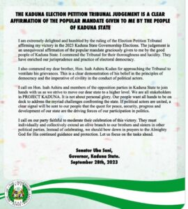 THE KADUNA ELECTION PETITION TRIBUNAL JUDGEMENT IS A CLEAR AFFIRMATION OF THE POPULAR MANDATE GIVEN TO ME BY THE PEOPLE OF KADUNA STATE
