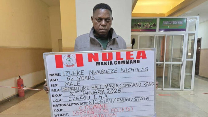 Kano, Nigeria — The National Drug Law Enforcement Agency (NDLEA) arrested 62-year-old Lagos businessman Nwabueze Nicholas Izueke at Mallam Aminu Kano International Airport (MAKIA). He tried to smuggle 95 wraps of cocaine hidden inside his body while traveling to China.