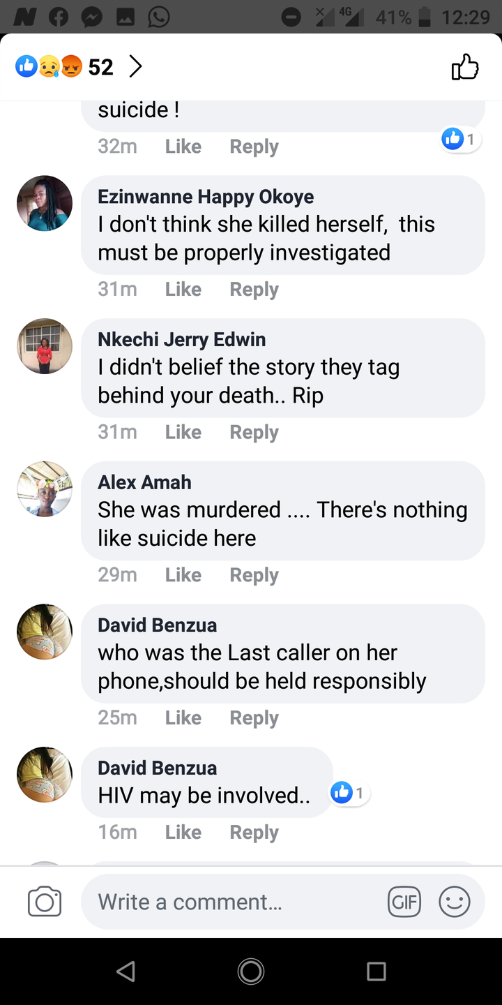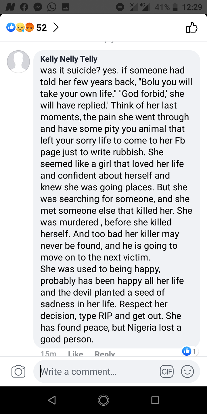 She is from Ijumu in Kogi, Parents resides in Ibadan . And many friends have taken to Facebook to Show their dismay and disapproval of her committing suicide. Here are some responses .