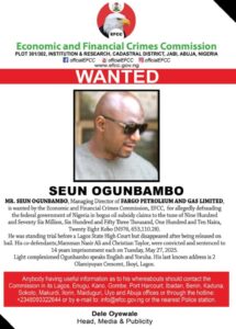 THE Economic and Financial Crimes Commission, EFCC has declared the Managing Director of Fargo Petroleum and Gas Limited, Mr. Seun Ogunbambo wanted for allegedly defrauding the Federal Government of Nigeria in oil subsidy Claims of N976, 653,110.28).
