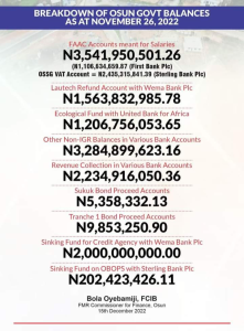 He went further to state the amounts Oyetola left behind as cash-in-hand and the banks in custody of the funds contrary to the claim of the incumbent administration that nothing will be left in the State treasury after the payment of November salaries.