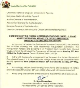 FEDERAL Government has said that the Federal Secretariat Complexes Phases l, ll and lll and the Ministry of Foreign Affairs in the Central Business District will be shut down for three days from May 26- 29, 2023 for the inauguration and swearing-in ceremony of President-elect, Asiwaju Bola Ahmed Tinubu at the Eagle Square, FCT, Abuja.