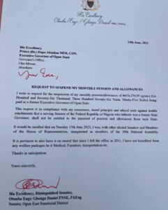 “After my inauguration at the Senate, I wrote H.E Prince Dapo Abiodun MFR, CON on June 14, 2023, to notify him of my decision to have the monthly payment of N676,376.95kobo being gross payment for my pension and allowances as former governor of the Ogun State suspended immediately.