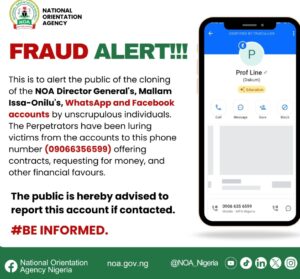 This is to alert the public of the cloning of the NOA Director General’s, Mallam Issa-Onilu’s, WhatsApp and Facebook accounts by unscrupulous individuals.