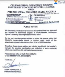 In a Press Release signed by the Public Relations Officer of the Teaching Hospital, Agbai Herientta available to SOJ WORLDWIDE, mass burials will be conducted on the abandoned corpses from 2014 to December, 2023.