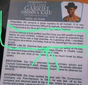 In the funeral brochure for the late Chief Gabriel Osonwa Kalu, aka Ete Ossy, his family made it clear that he fell short of their expectations.