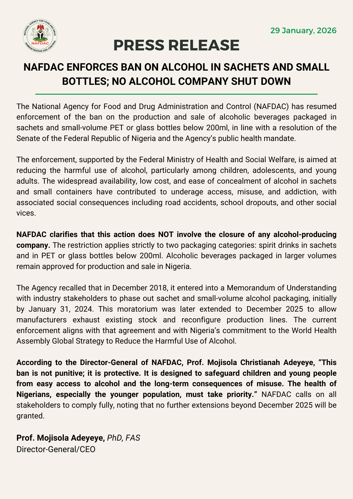 NAFDAC explained that sachet alcohol and small-sized bottles encourage abuse and undermine ongoing efforts to promote responsible drinking in society.