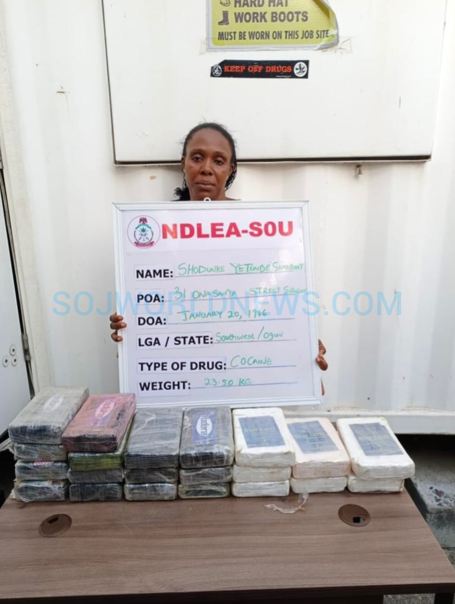 Operatives of the NDLEA arrestes woman 39-year-old in Lagos after a major cocaine seizure.