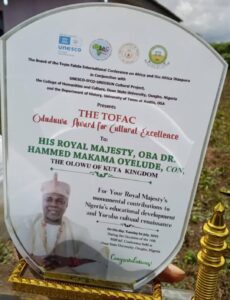 His Royal Majesty, Oba Dr. Hammed Makama Oyelude, CON, The Olowu of Kuta Kingdom on Tuesday, July 1, 2025 received the TOFAC Oduduwa Award for Cultural Excellence for Royal Majesty’s monumental contributions to Nigeria’s educational development and Yoruba cultural renaissance.