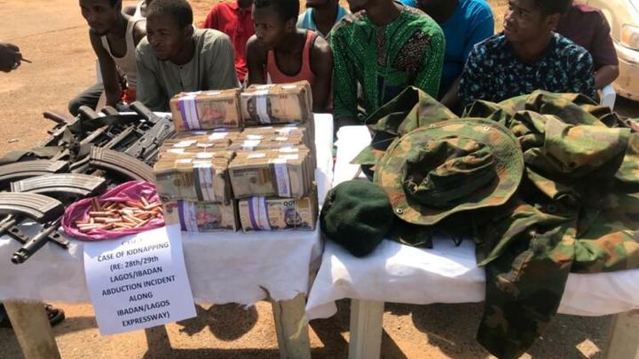 The kidnappers were paraded alongside other suspects at the state Police Command Headquarters Eleyele Ibadan with military camouflage. However, an undisclosed sum of money, AK Rifles, and some other ammunition was caught with the suspects.