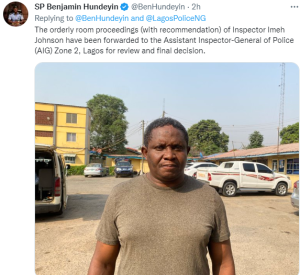Hundeyin shared Inspector Imeh’s photo and stated that the orderly room proceedings (with recommendation) have been forwarded to the Assistant Inspector-General of Police (AIG) Zone 2, Lagos for review and final decision.