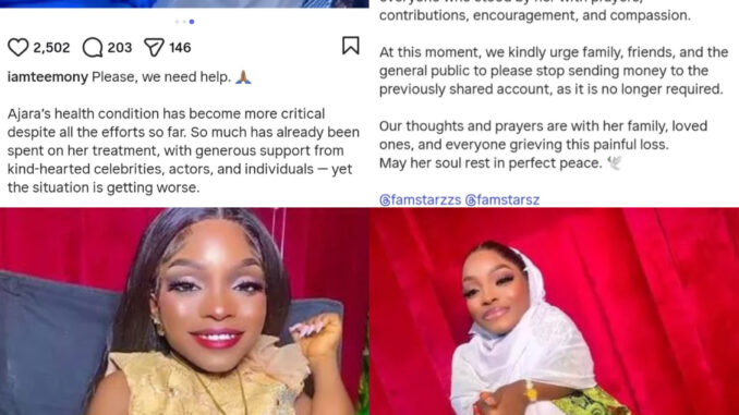 Aunty Ajara’s elder brother, Ridwan Lasisi, shared the news in an emotional video on social media. He said doctors confirmed her death early Thursday. Ridwan thanked everyone who supported her during her illness. He also asked the public to stop sending funds raised for her treatment, now that she has passed.