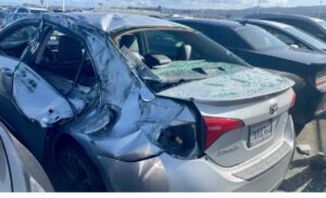The tire debris landed in an employee parking lot at the airport, Yakel said. Several cars were damaged but there were no reports of injuries, he said.