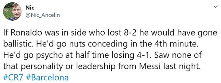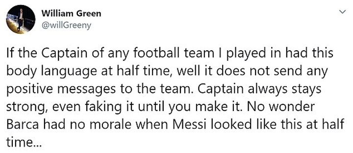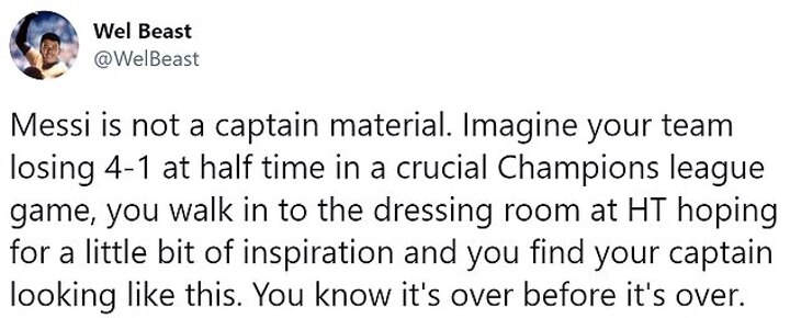 One user believes that Messi is ‘not captain material’. They believed that Barcelona’s players would have written the game off after only 45 minutes judging by their leader’s lack of reaction.