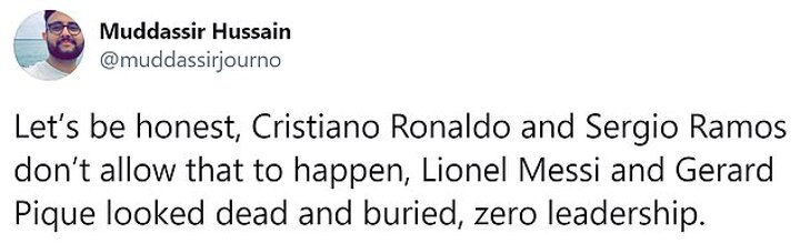 Another wrote: ‘Let’s be honest, Cristiano Ronaldo and Sergio Ramos don’t allow that to happen. Lionel Messi and Gerard Pique looked dead and buried, zero leadership.’