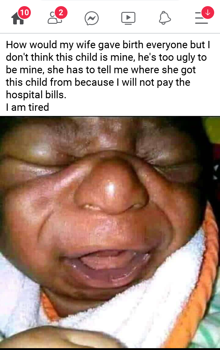The father whose wife delivered a baby at the hospital has refused to pay the bills because he was not sure the baby belonged to him. He based his refusal to pay the bills on the fact that the baby is too ugly, he doubted the paternity.