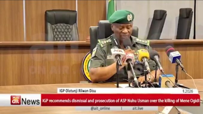 Mene Ogidi killing – The Inspector-General of Police, Olatunji Rilwan Disu, has ordered the dismissal and prosecution of Assistant Superintendent of Police (ASP) Nuhu Usman and other officers involved in the extrajudicial killing of 28-year-old Mene Ogidi in Effurun, Delta State.